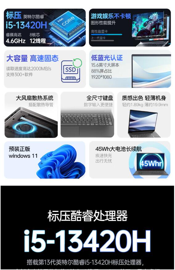 商品名称:联想笔记本电脑V15 2023轻薄设计游戏本小新品 15.6英寸大屏学生商用办公手提本 十三代酷睿标压 i5-13420H 16G内存 512G固态