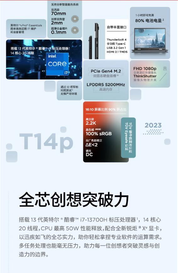 商品名称:ThinkPad T14p 联想 13代英特尔酷睿标压 T系列工程师商务办公高性能笔记本电脑 14英寸轻薄本2.2K高色域屏 i9-13900H