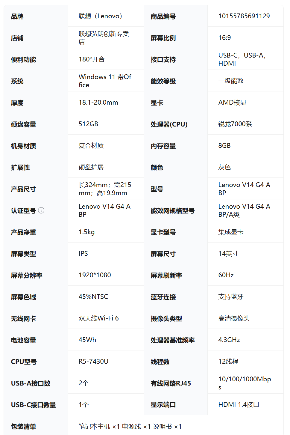 商品名称:Lenovo V15 G4 ABP NBLN V15 G4 ABP R5 7430U 8G 8G 512G 11C