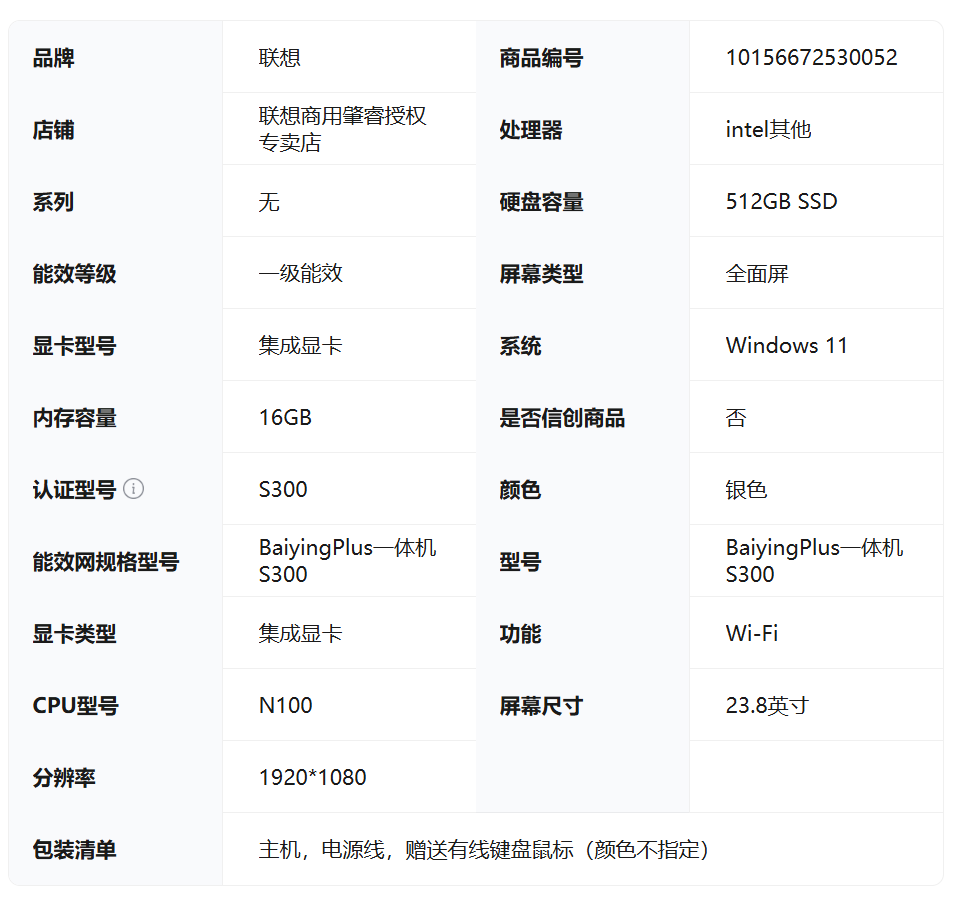 商品名称:BaiyingPlus一体机S300N4 BaiyingPlus一体机S300 N412N10016G512GW-11S