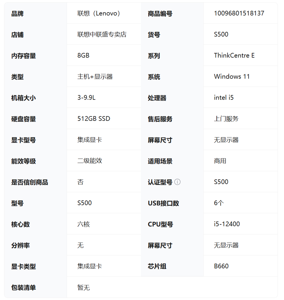商品名称:ThinkCentre neo S500IRB-00 ThinkCentre neo S500IRB-73 I5-12400 8G512-11